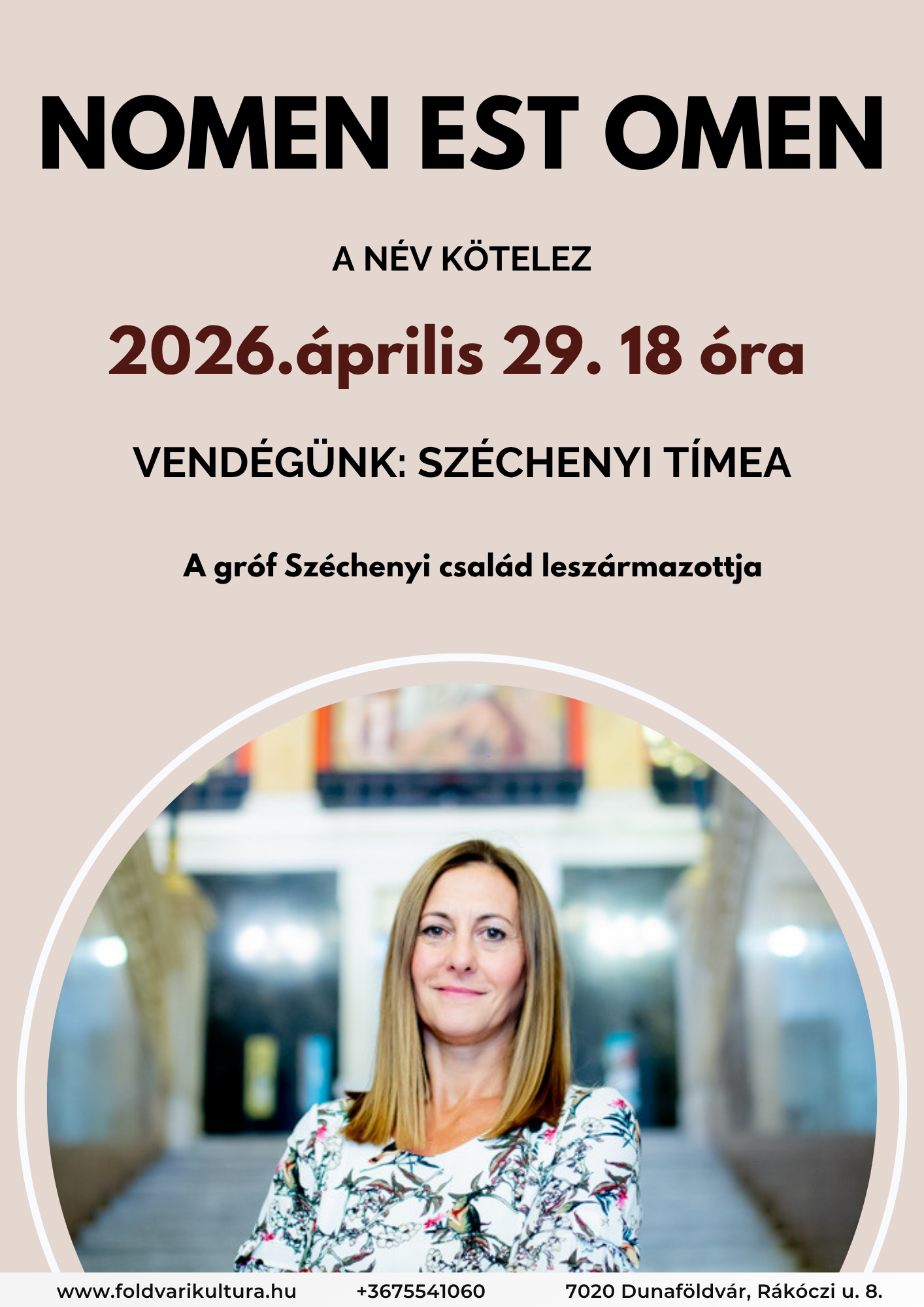 A „Nomen est omen – A név kötelez” című előadás a Széchenyi család történetén keresztül mutatja meg, hogyan formálja örökségünk a jelenünket és a jövőnket. Egy személyes hangvételű, vetítéssel kísért alkalom, amely gondolatébresztő beszélgetésre is hív.