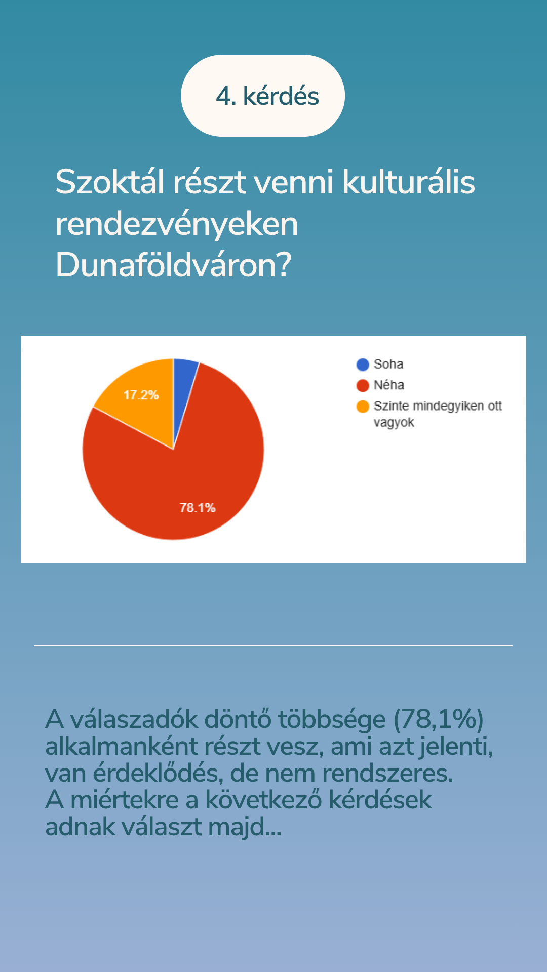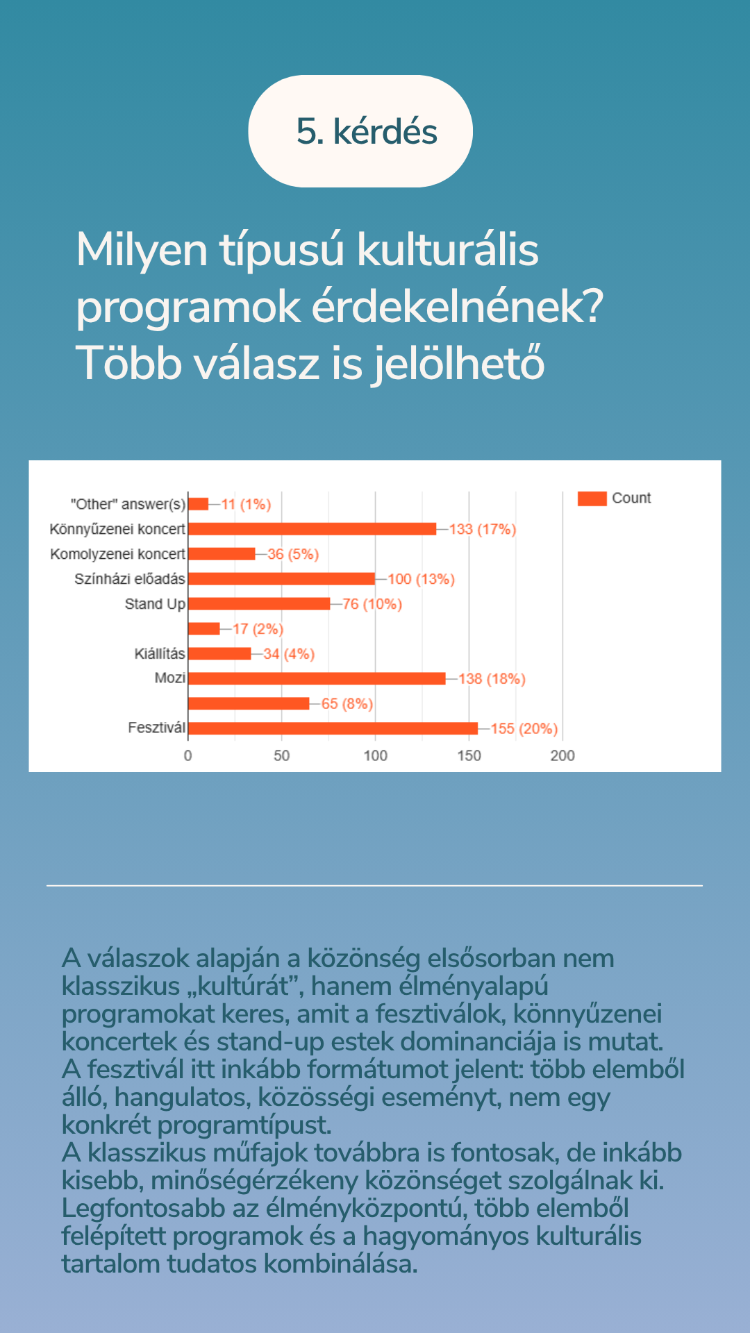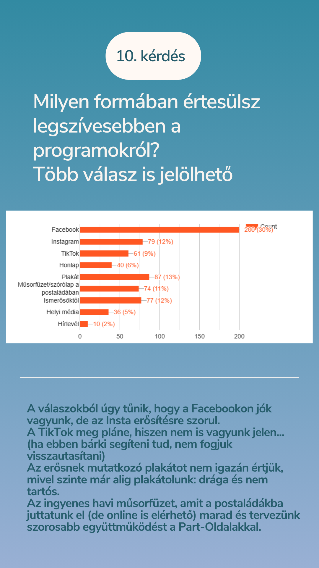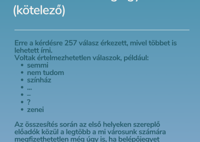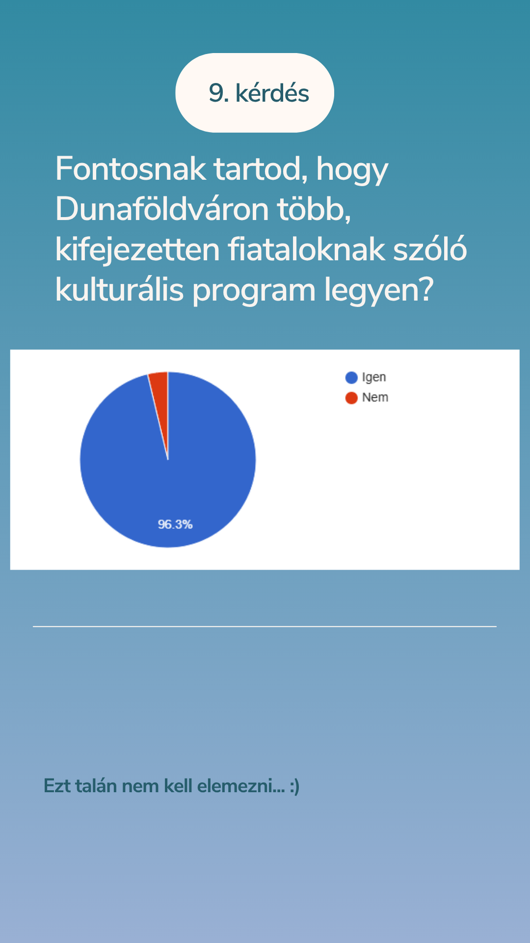 Szeretném itt is mindenkinek megköszönni, hogy a kérdőív kitöltésével segítette a munkákat. Igyekszünk megfelelni az elvárásoknak és úgy formálni a város kulturális programjait, hogy azok igazodjanak a fiatal korosztály jogos igényeihez is. Ezért itt is arra biztatnék mindenkit, hogy ne otthon, magában puffogjon, hanem jelezze, ha bármi nem jó, másra lenne igény vagy jobb ötlete van. Bátran lehet nyilvánosan is megírni a közösségi platformokon, csak taggeljék be a Művelődési Központ Facebook vagy Instagram oldalát, hogy eljusson hozzánk!
