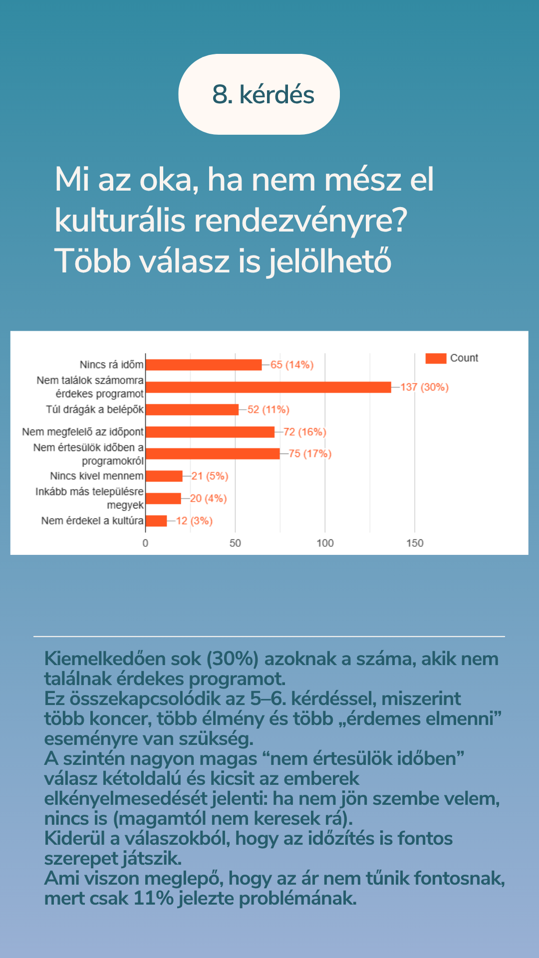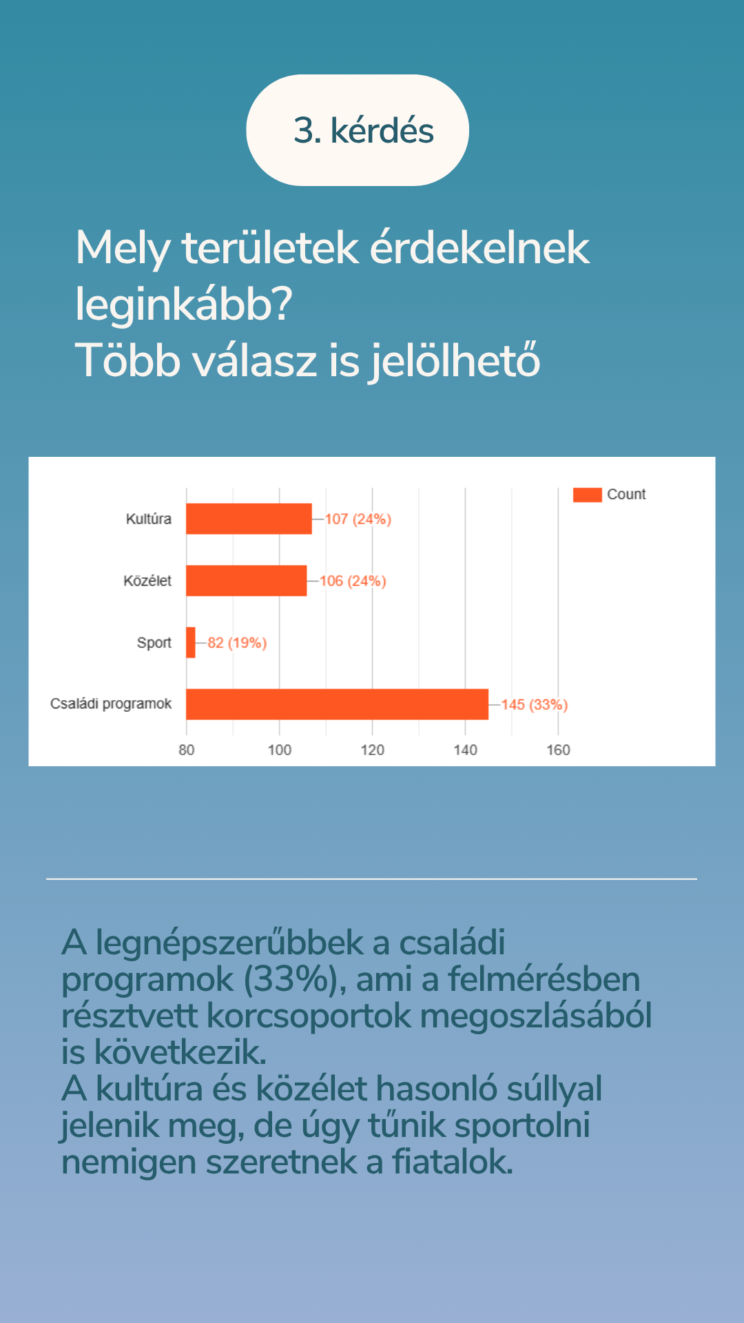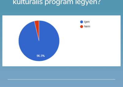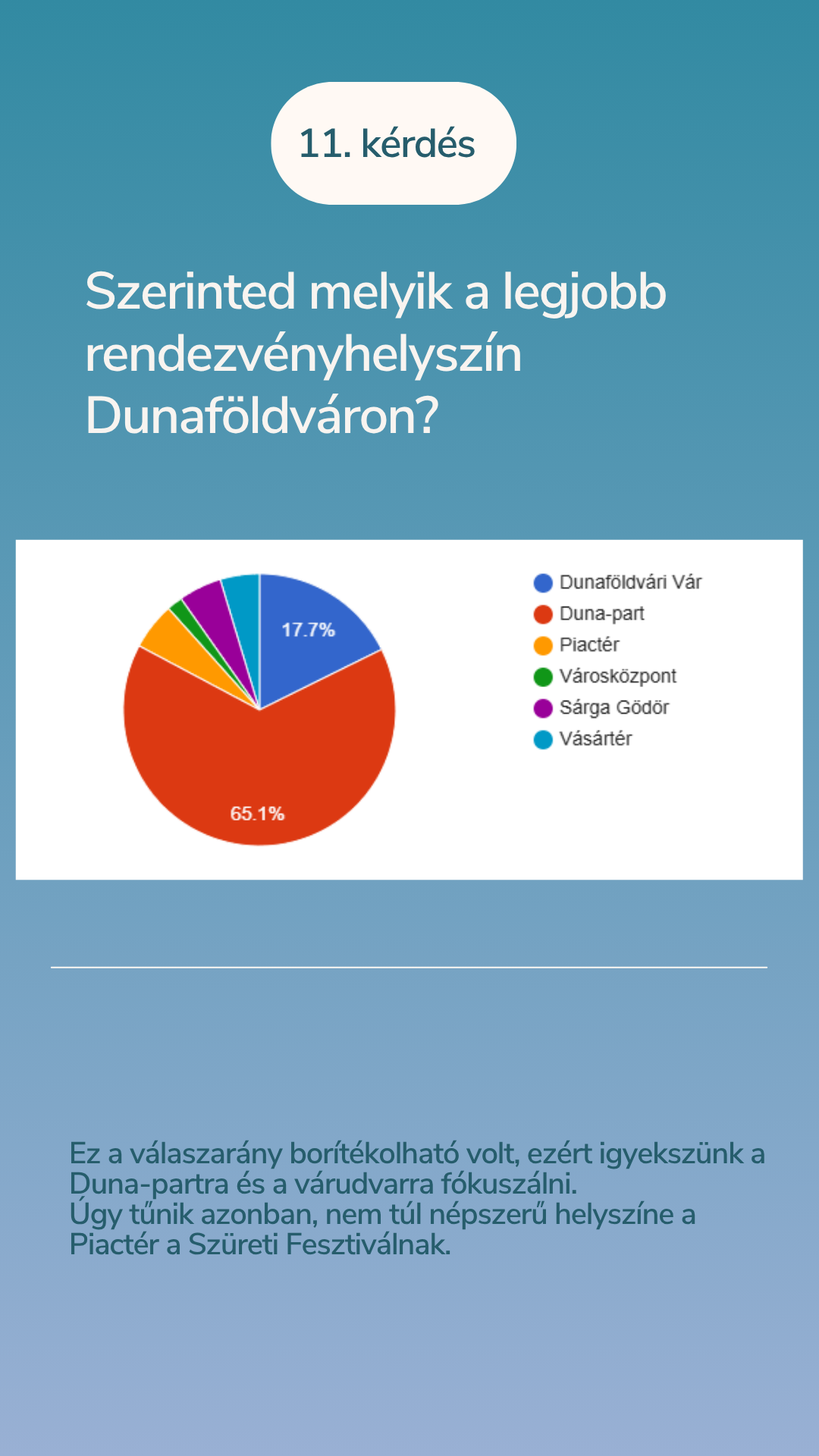 Szeretném itt is mindenkinek megköszönni, hogy a kérdőív kitöltésével segítette a munkákat. Igyekszünk megfelelni az elvárásoknak és úgy formálni a város kulturális programjait, hogy azok igazodjanak a fiatal korosztály jogos igényeihez is. Ezért itt is arra biztatnék mindenkit, hogy ne otthon, magában puffogjon, hanem jelezze, ha bármi nem jó, másra lenne igény vagy jobb ötlete van. Bátran lehet nyilvánosan is megírni a közösségi platformokon, csak taggeljék be a Művelődési Központ Facebook vagy Instagram oldalát, hogy eljusson hozzánk!