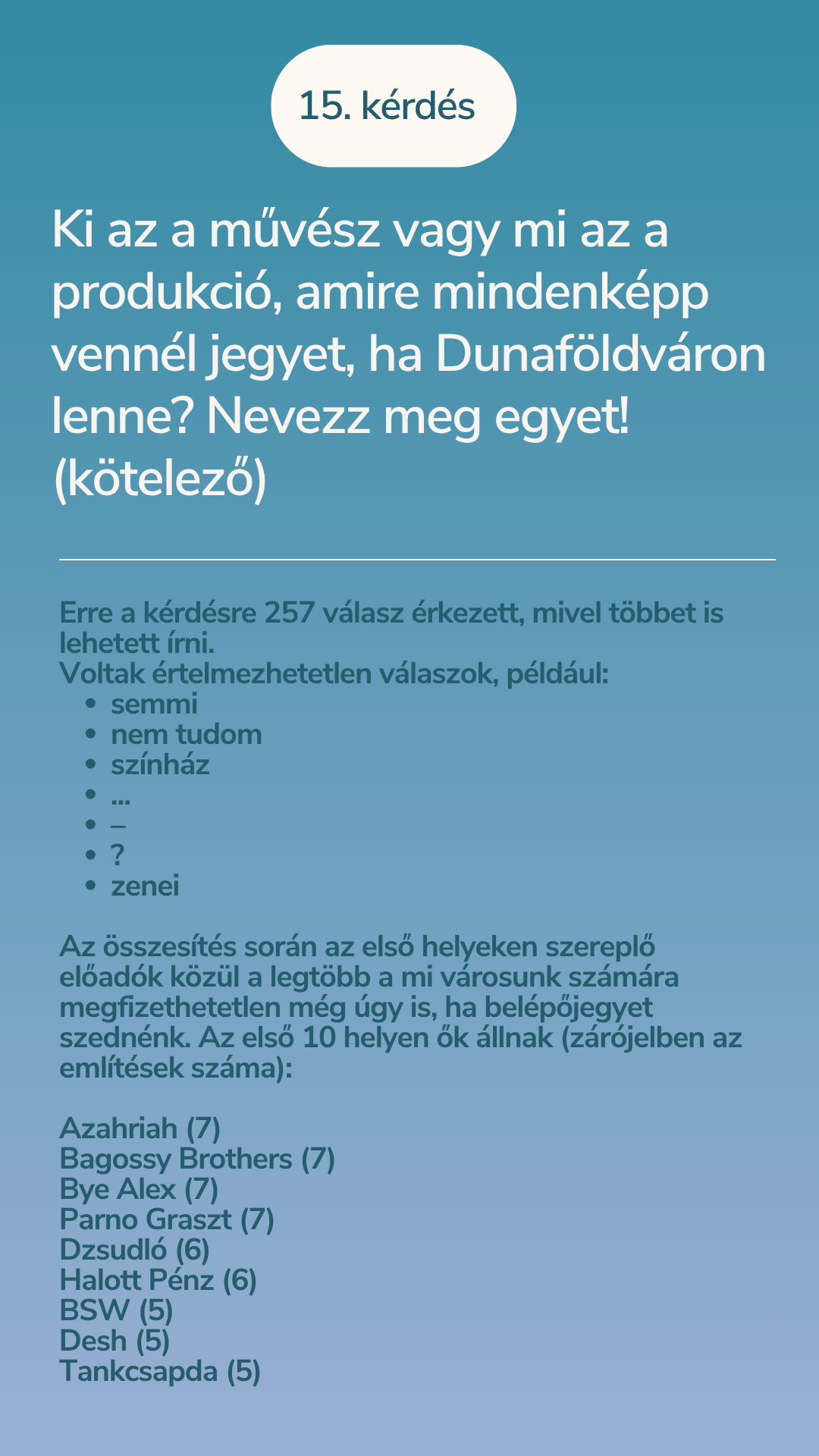 Azt javaslom, hogy a városi rendezvények esti koncertjeire (például augusztus 20-án vagy a szüreti napokon) olyan előadókat hívjanak, akiket mi, fiatalok is kedvelünk. Sokak által kedvelt előadók például: BSW, Manuel, Valmar, Desh, Azahriah, Dzsúdló és Beton.Hofi. Tisztában vagyok azzal, hogy egy-egy ilyen művész fellépése jelentős költséggel jár, de szinte biztos vagyok benne, hogy ezekért a nevekért sok fiatal hajlandó lenne belépőt fizetni. Több ismerősöm is szívesen ellátogatna Dunaföldvárra az esti koncertek miatt.