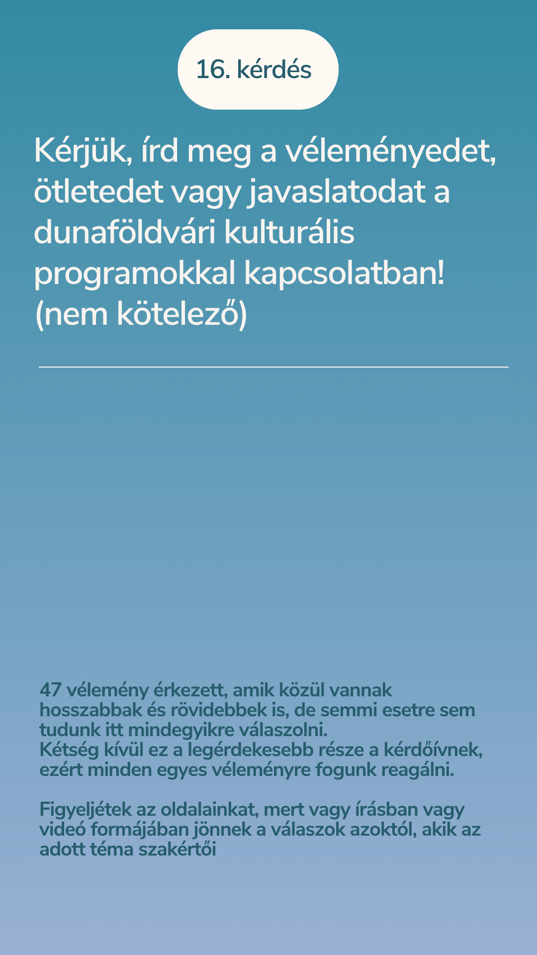 Kérjük, írd meg a véleményedet, ötletedet vagy javaslatodat a dunaföldvári kulturális programokkal kapcsolatban!