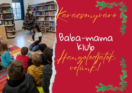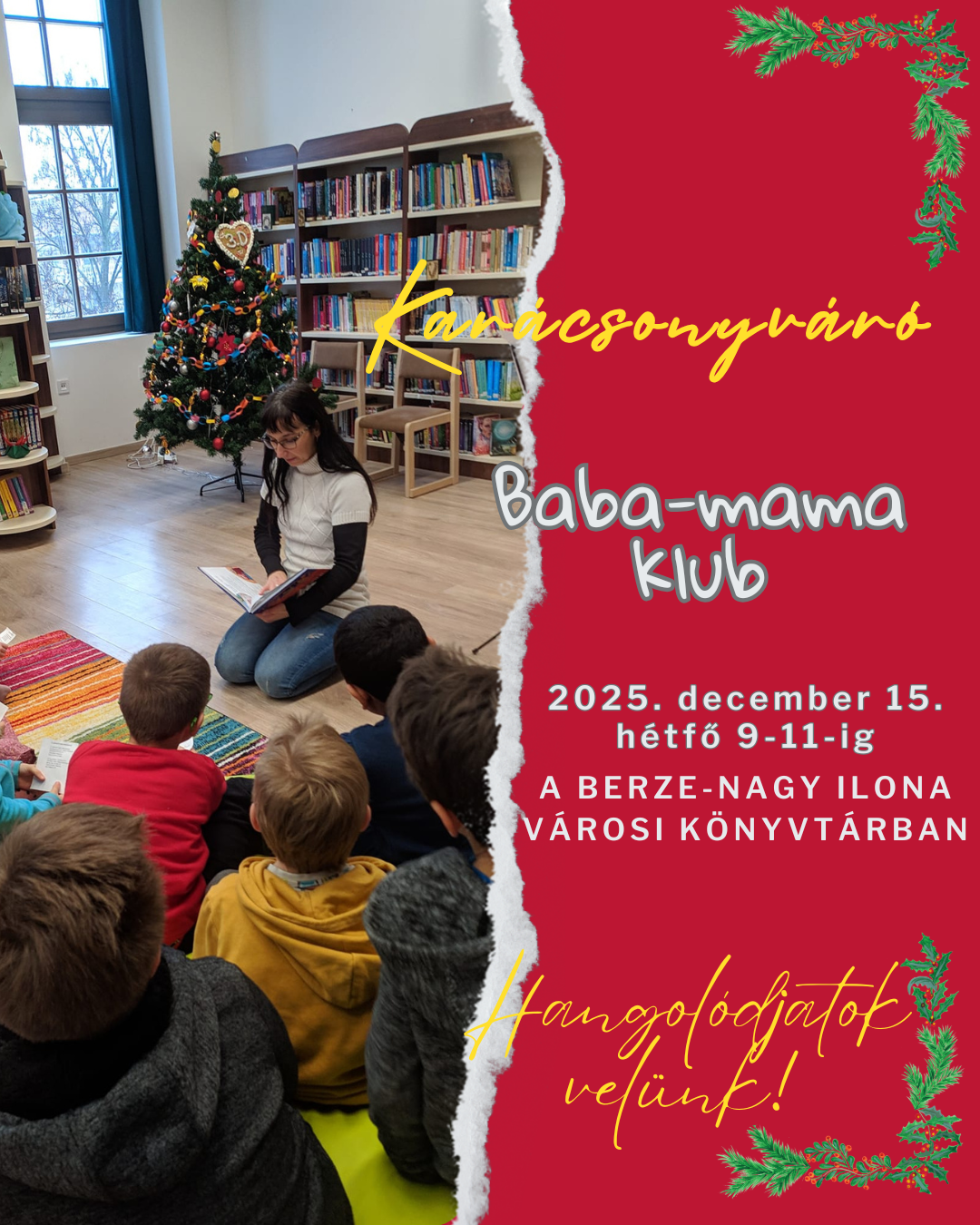 Szeretettel várlak benneteket a karácsonyváró baba klubban december 15-én hétfőn 9-11 óráig. A foglalkozás keretében hangszerkíséretes zenével, mesével, papírszínházi előadással készülünk, a gyerekeket is bevonva a készülődés örömébe.