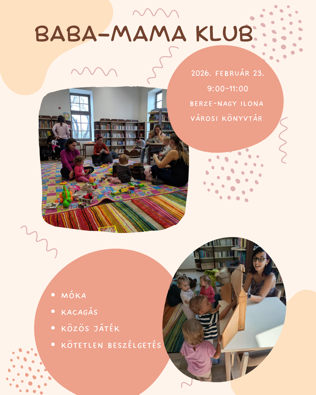 Szeretettel várok mindenkit a Baba-Mama Klub rendezvényeire. Apukákat és nagyszülőket is. Kéthetente találkozunk a könyvtárban.