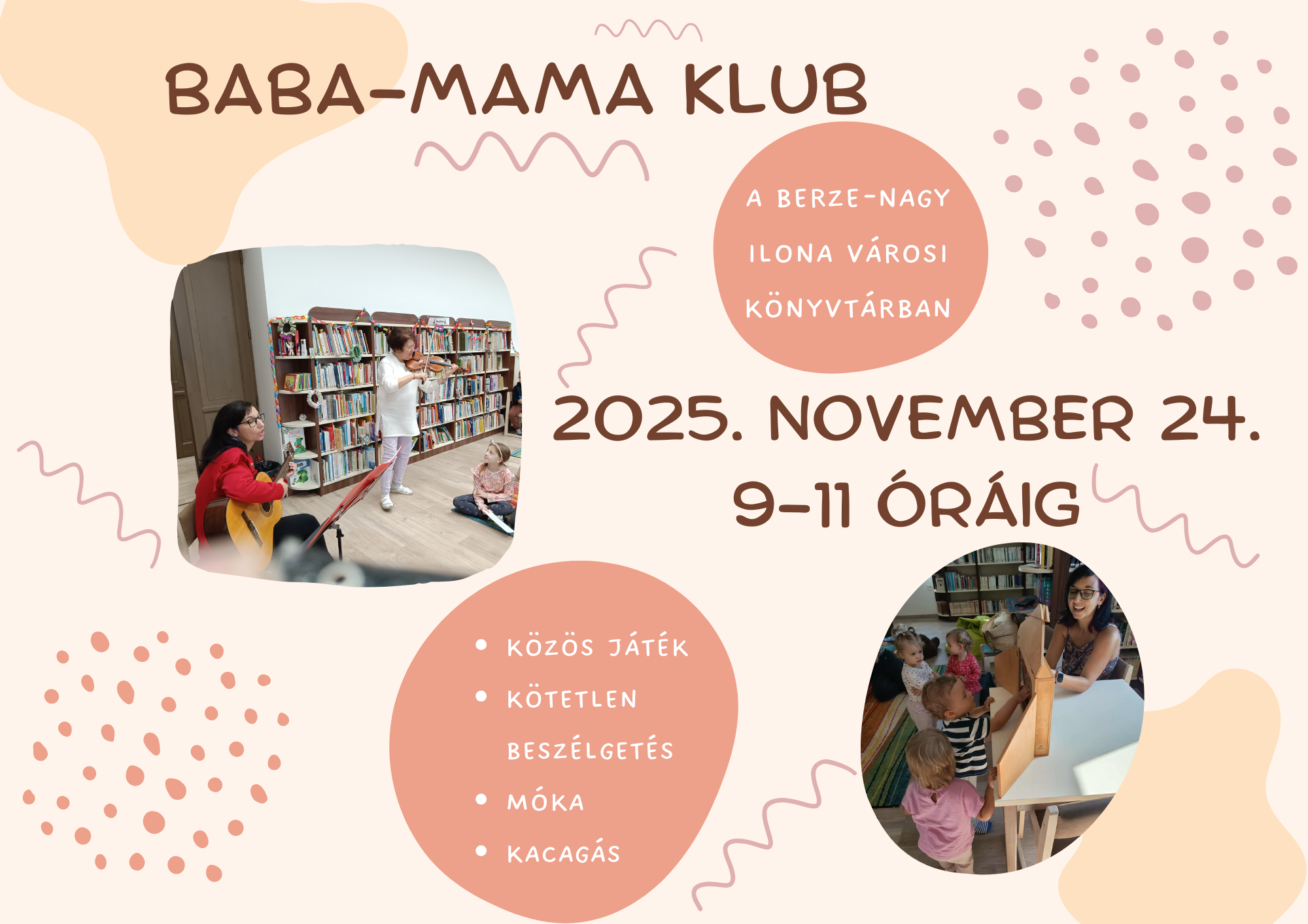 Szeretettel várok mindenkit a Baba-Mama Klub rendezvényeire. Apukákat és nagyszülőket is. Kéthetente találkozunk a könyvtárban.